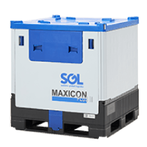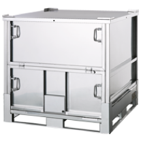 1.1×1.1mのパレットサイズで、トラック、鉄道、海上コンテナ輸送に最適。折畳式で、組立時の1/3の高さに畳めます。充填時には5段積み、折畳時には15段積みが可能です。