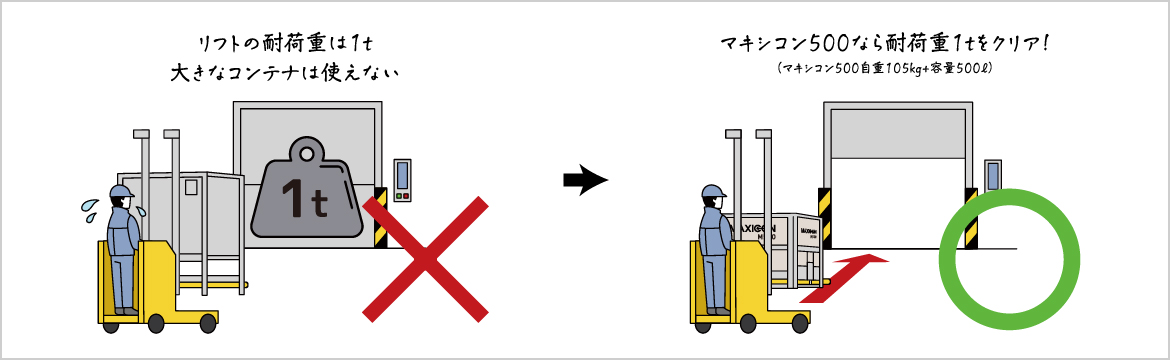 マキシコンは、1,000L容量以外の折り畳み可能な容器もご用意しています。H社様には、幅が780mmとコンパクトなマキシコン500を採用していただきました。自重105kg、容量500Lですから、耐荷重制限の問題もクリア。これまでパレットでの運用が難しかった幅の狭い場内でも取り回しが可能になり、人の手で運ぶ必要がなくなったことで大幅な作業改善につながりました。