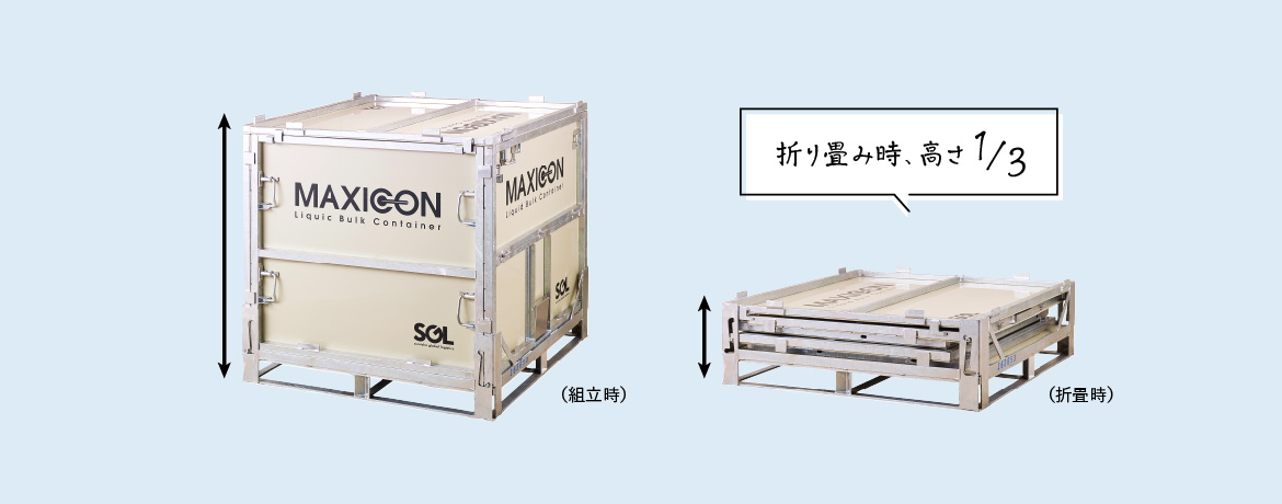 マキシコン最大の特徴は折り畳めるということ。これにより効率的な輸送と保管を実現します。