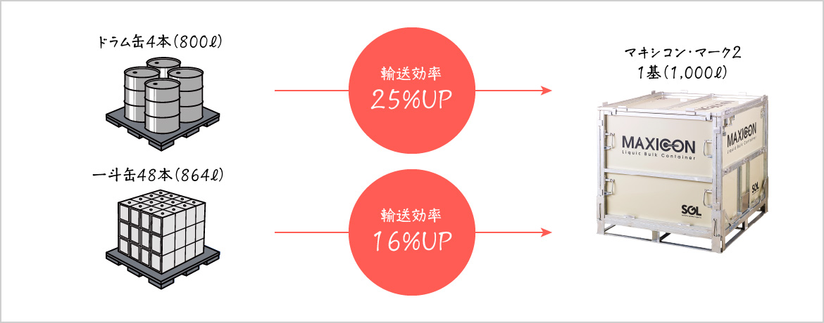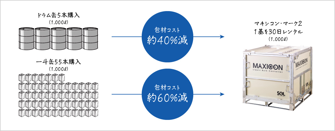 「マキシコン・マーク2」1基と同じ1,000Lの液体をドラム缶、一斗缶に入れるためには、ドラム缶は5本、一斗缶55本が必要です。これらの容器(包材)を購入した場合とマキシコンを30日間レンタルした場合、マキシコンをレンタルした方が包材コストを抑えられます。さらに、マキシコンなら包材コストだけでなく、保管・輸送にかかるコストの削減も可能です。