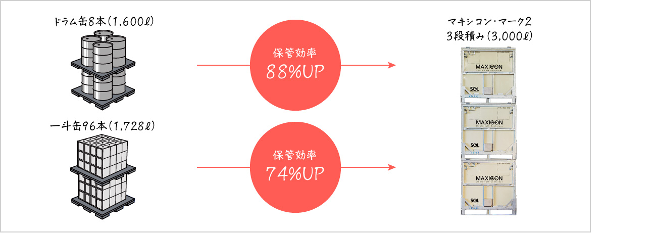 約1㎡に保管できる容量を比較にした場合、ドラム缶に比べ88%、一斗缶に比べ74%アップします。秘密はマキシコンの構造。パレットサイズでスペースを無駄なく使えます(最大5段積みが可能)。空の状態で1/3に折り畳めるので、使用前後の保管にも困りません。また、必要に応じて1基からレンタルできますので、使わない時には返却すれば保管スペースの確保に困ることもなくなります。